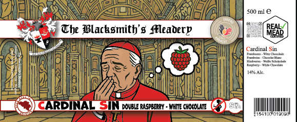 Cardinal Sin is onze tweede release voor vandaag. Het is een double raspberry – white chocolate mede. Double raspberry, want er zit precies dubbel zoveel framboos op als onze standaard fram bozenmede, Sanguis Nobilis. Dankzij de combinatie met witte chocolade is het resultaat een fluweelachtige mede die je waarvan je zo hard zal genieten dat het inderdaad wel eens zondig zou kunnen zijn.